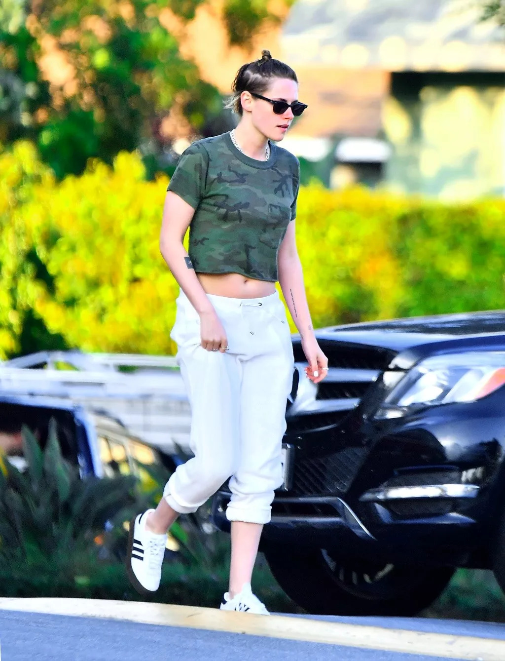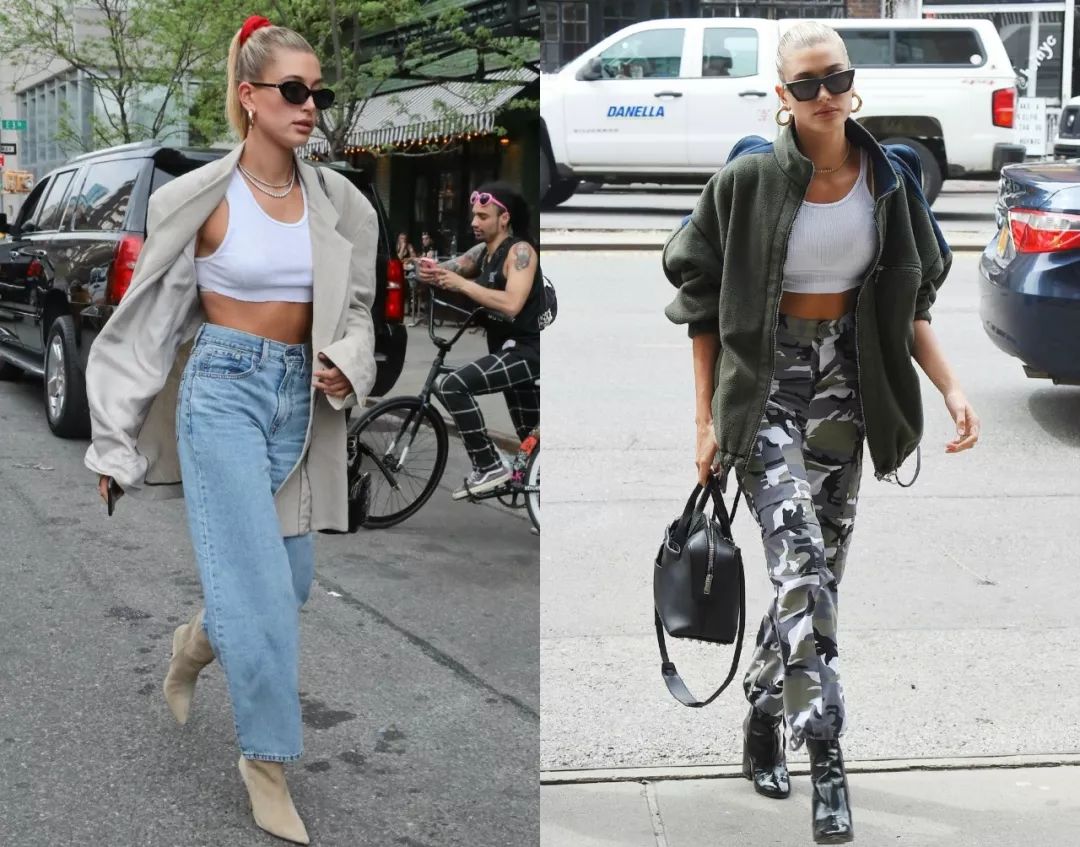 Crop Top(超短上衣)也是凸显曲线的利器,有马甲线的小细腰妹子们也可以学习海狸的这一系列穿搭,不论是牛仔裤、迷彩还是阔腿裤都可以一键get,黑超墨镜那么一带,怎么穿都很帅气。