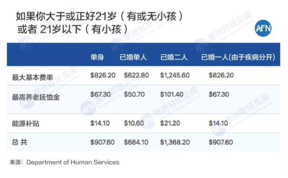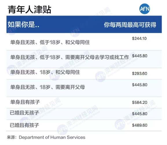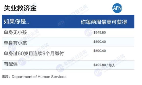 新起点(Newstart Allowance )失业救济金通常每两周发一次。申请人通过收入测试后可以后领取,救济金额大小因人而异,下列金额都为最高金额。按规定,申请人需要22岁以上,并正在找工作。更多信息请见: