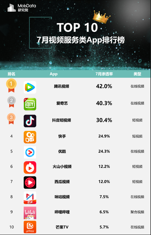 以市场渗透率为标准,MobData研究院发布视频服务类App排行榜。