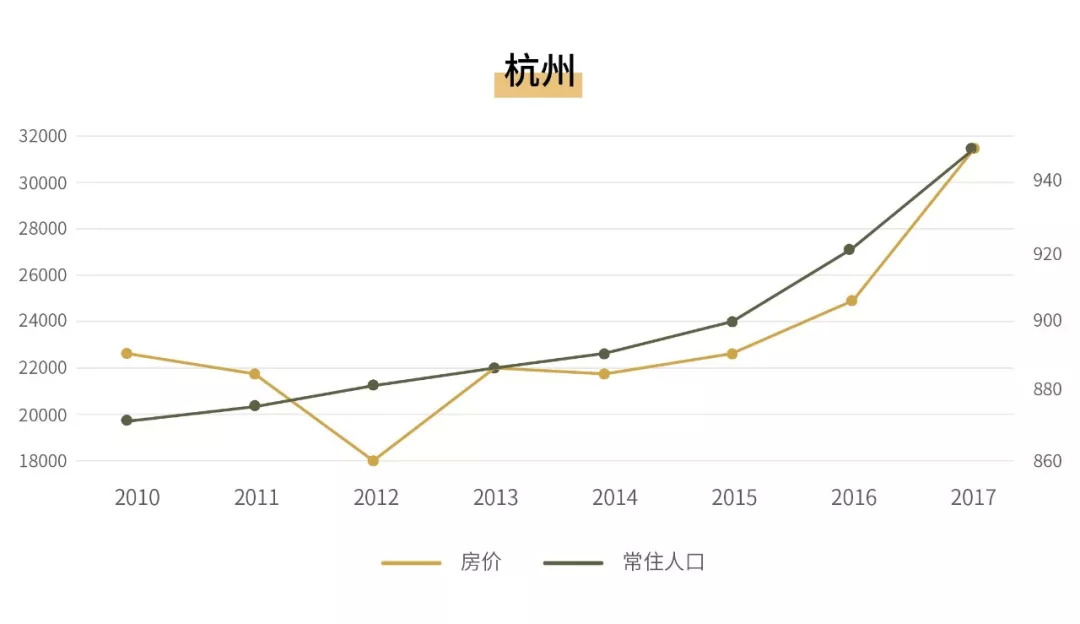 而从总体人口数据来看,杭州常住人口环比增速也从2011年的0.38%不断攀升,至17年人口增速已达3.05%。杭州市开放的人口政策,薪资收入,以及相对较低的房价,使得其人口吸引力十分强大。人才的大量涌入不仅推动城市本身的综合发展,也推动杭州的房价水平。杭州房价在2010至2015年间波动持平的过程后,2017年环比增速已达26.86%。