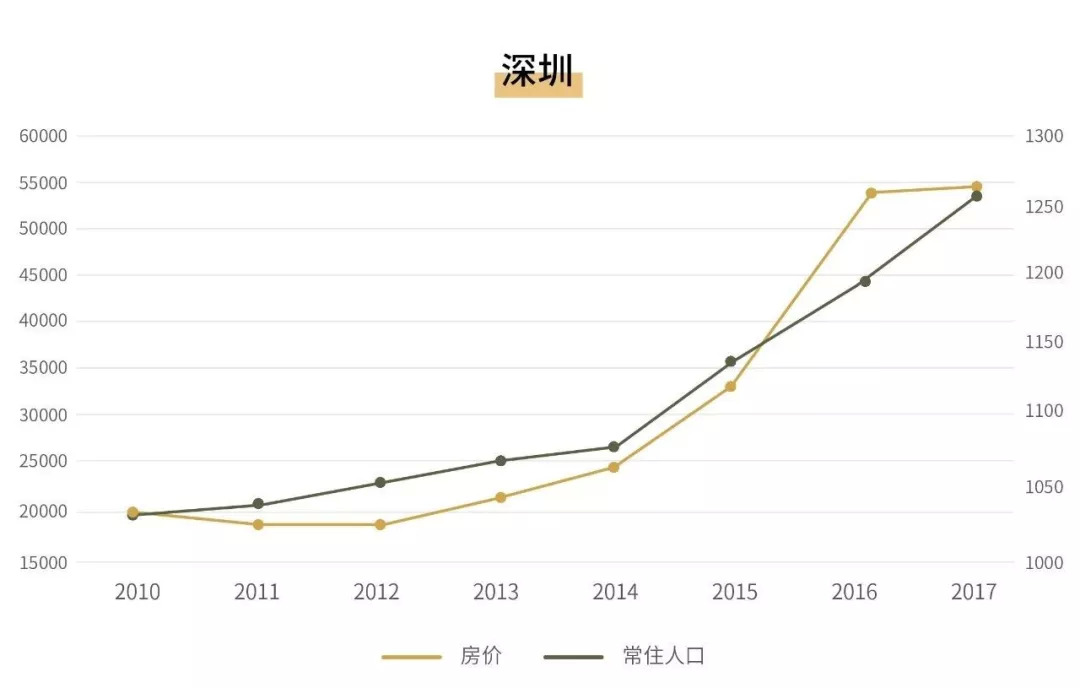 深圳其本身的城市竞争力已经囤积了大量的人口流入潜力,一旦实行较为宽松的人口政策,人口流入就如同开闸蓄洪。相应的,深圳住宅价格也在2014至2016年间全国房价走低的大背景下,受到人口流入红利的影响大幅上升,16年环比涨幅接近60%,虽然在17年楼市调控加强后减缓了上涨速度,但依旧有一定的上涨趋势。