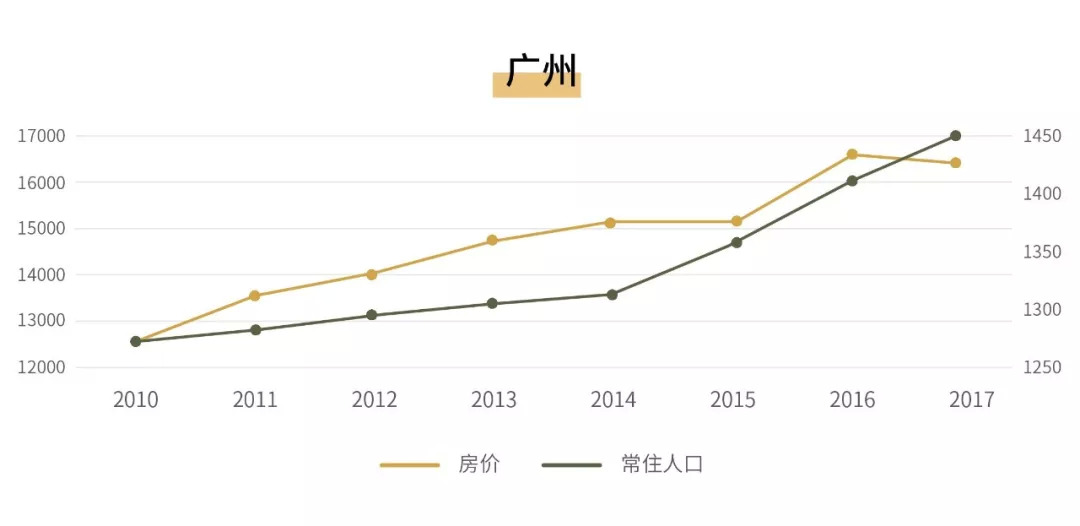 面临人口达到当前城市容量上限的压力,广州人口落户政策的放宽,更多是针对人口结构的细分规划调整。因此广州城市房价与深圳、杭州相比,增长动力稍显不足,17年全国实施房价调控措施以来,也成为了“北上广深”城市中唯一一个房价下行的城市。