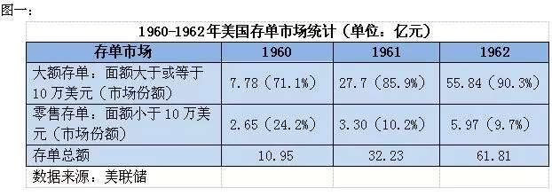 为增强存款在货币市场竞争力、扩大资金吸收能力,商业银行开始谋求新的筹资渠道,创作了大量新金融工具来逃避管制。正是在这一背景下,大额可转让存单应运而生,美国利率市场化也由此拉开帷幕。1961年,纽约的城市国民银行(花旗银行)推出第一张10万美元以上可在二级市场上转卖的大额可转让存单。随后大额存单的快速增长推动了存单市场的快速扩张。从1961年大额存单推出后,存单市场总额从1960年的10.95亿美元提升至1962年的61.81亿美元(如图一所示)。1967年,大额存单规模达到185亿美元。