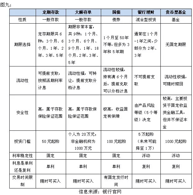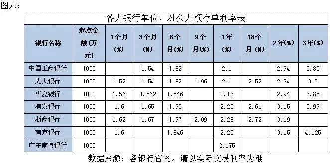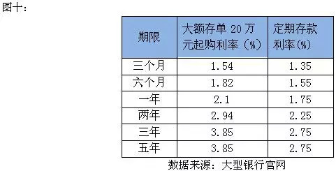 除了投资产品的安全性和流动性,投资人最关注的仍是收益性。下面将详细对比各类投资方式的收益率。以大型国有银行为例,大额存单利率较同期限定期存款更具竞争力(如图十所示)。而相对银行储蓄类产品收益率较高也是大额存单的一大优势。