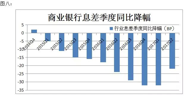 在存款规模增量递减和利率市场化不断推进的大背景下,银行为吸收存款会提高存款利率,使银行负债成本大幅上升(如图七所示),因此,银行通过赚取息差的盈利模式无法持续,经营模式转型压力增加。据统计2016年商业银行净息差同比下降,且降幅逐季扩大(如图八所示)。并且,随着互联网金融平台的不断崛起,使得市场竞争更激烈,为了在激烈的竞争中寻求生存,提升多元化的盈利能力,向“轻型银行”方向转型成为国内商业银行的重要发展战略。有数据表明在2015年-2017年之间非利息收入占比呈上升趋势;2017年零售业务成为多家银行的首要发力方向。