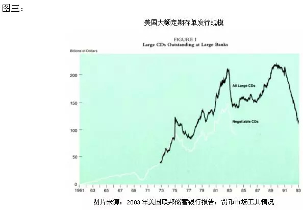 1970年美联储取消10万元以上三个月以内大额存单利率限制,准许证券公司引入货币市场基金后,小额储户通过货币市场基金投资大额存单。存单规模迅速发展(如图三所示),存款市场占比大幅提升,大额存单成为货币市场主要工具之一。