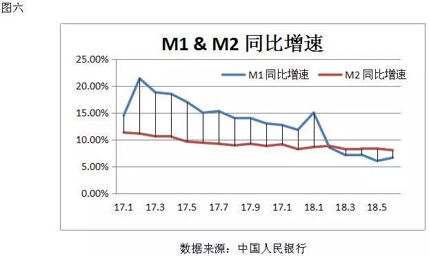 为了防控金融风险促进金融体系内部的良性循环服务于供给侧改革,近两年监管层加强了监管,先后开启了去杠杆、拆解影子银行等。在去杠杆环境下,2017年M2持续低增长(如图六所示),银行业资产负债表增速明显回落。央行发布的2018年上半年金融统计数据报告显示,截止至今年上半年人民币存款余额177.02万亿元,同比增长8%,创历史新低,同比减少1.1个百分点,环比下滑0.3个百分点。