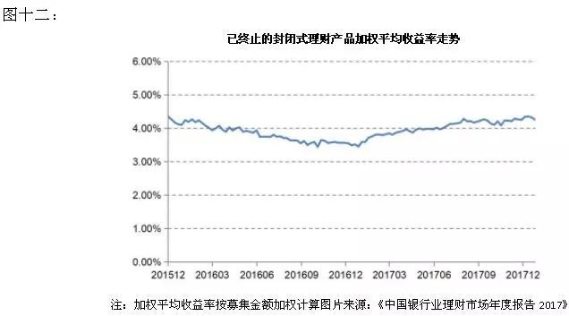 然而,银行理财产品收益率就明显比大额存单和国债高多了。2017 年全年封闭式产品按募集资金额加权平均兑付客户年化收益率为 4.06%,较 2016 年上升 27 个基点。2017 年,已终止的封闭式理财产品收益率呈现出上升趋势,从年初的平均 3.5%左右上升至平均 4.3%左右(如图十二所示)。大部分理财产品为短期,今年7月份一年期及以上银行理财产品平均收益也在4.98%。因此,大额存单及国债的年化收益率远不及银行理财的。