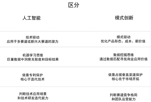 由技术驱动的AI项目理应承受高估值、高风险,而模式创新型项目的估值应该更趋于理性平和。我们可以通过以下标准划分技术驱动型AI项目和模式创新型项目。