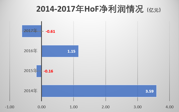 2014年年报显示,HoF实现收入43.83亿元,实现净利润3.59亿元。但2015年的净利润直转直下。当年收入实现126亿元,净利润转盈为亏,当年亏损1617万元。2016年以及2017年的收入继续下滑,分别只实现了119.6亿元以及107.67亿元;两年净利润分别为1.15亿元以及亏损6128万元。
