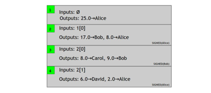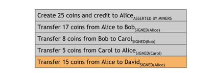 这种做事方式的缺点是,任何想要确定交易是否有效的人都必须跟踪这些账户的余额。再来看看图3.1。Alice试图转移15个硬币给大卫,如何确定她有这些?为了弄清楚这一点,你必须一直回头看看每一个影响Alice的交易,以确认她试图向大卫转移15个硬币时的净额是否大于15个硬币。当然,我们可以通过一些数据结构来跟踪Alice在每个交易之后的余额,使其更有效率。但是,除了分类账本身之外,还需要大量的额外管理。