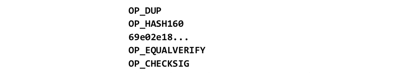 首先我们有重复的指令OP_DUP,所以我们只需将公钥的副本推到堆栈的顶部。下一个指令是OP_HASH160,它告诉我们弹出顶部值,计算其加密哈希,并将结果推送到堆栈的顶部。当这个指令完成执行时,我们将堆栈顶部的公钥替换成它的哈希。