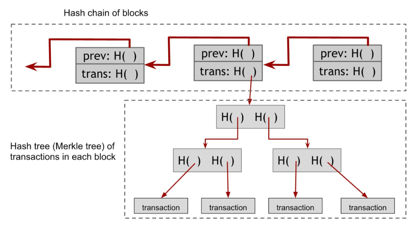 第一个是将不同区块相互链接的区块哈希链。第二个是每个区块的内部,是区块内的交易Merkle树。