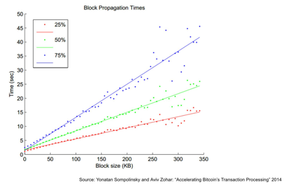洪水算法的延迟是多少?图3.10中的图表显示新区块传播到网络中每个节点的平均时间。这条线显示了25个、50个和75个百分位数的传播时间。可以看出,传播时间基本上与区块的大小成比例。这是因为网络带宽是瓶颈。较大的区块占用超过30秒,才能传播到网络中的大多数节点。所以这不是一个特别有效的协议。在互联网上,30秒是相当长的时间。在比特币的设计中,拥有一个简单的网络,结构简单,节点相等,可以随进随出,优先于效率。因此,在到达网络中最远的节点之前,区块可能需要经过许多节点。如果网络是为了效率而自上而下地设计,我们可以确保任何两个节点之间的路径很短。