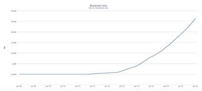 图3.11.区块链的大小。完全验证节点必须存储整个块链,截至2014年底,该链为26千兆字节。