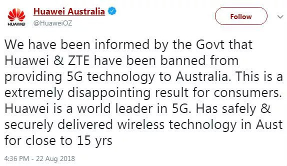 一大早,华为澳大利亚分公司在其官方推特发出声明,称已被澳大利亚政府通知禁止成为澳大利亚5G网络设备提供商。