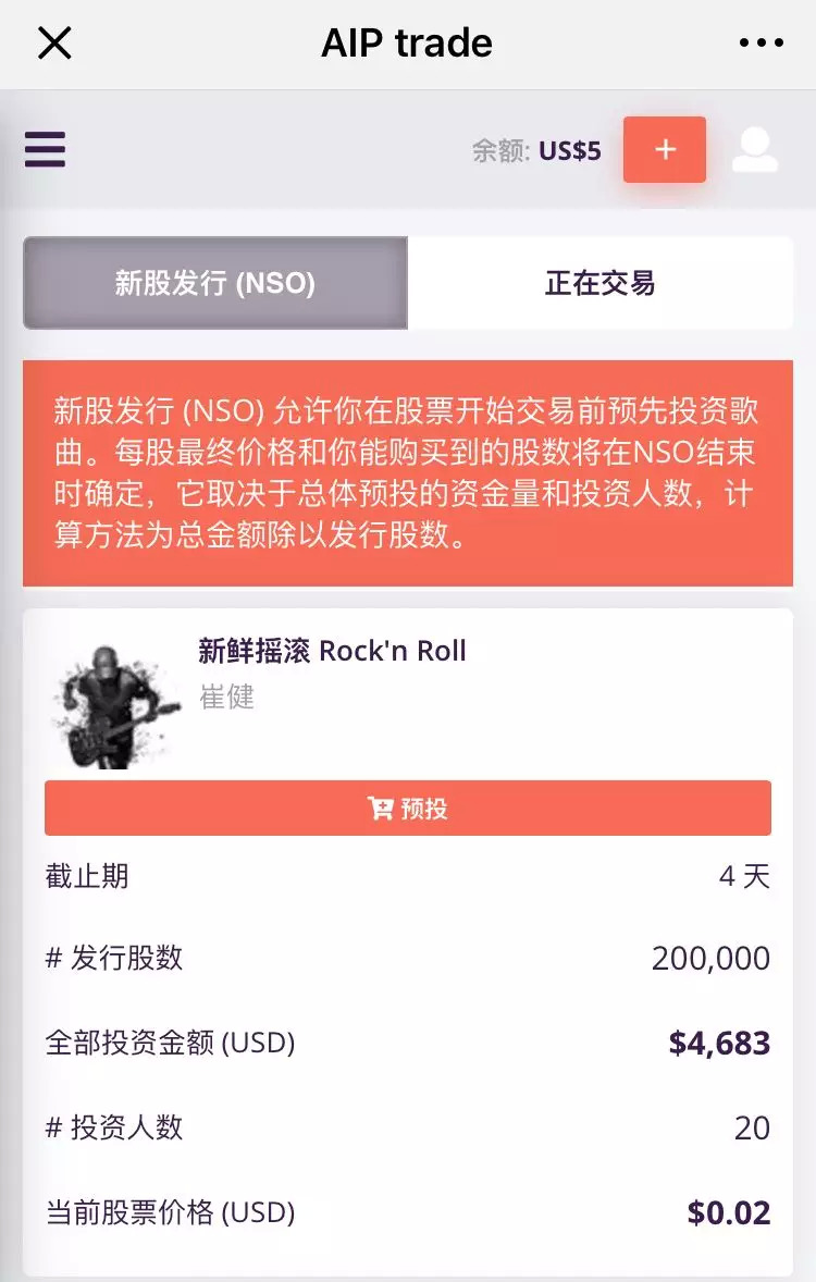 紧接着,平台会给音乐人一个时间决定,最终的结果是否能接受。如果每股2块离自己的预期差太多,便可以不对该歌曲进行股票发行。如果最后的结果是8万块,虽然略低于自己的估价,但是音乐人也可以选择接受。所以,实际上双方都有决定和退出的权利,但时间节点一过,“股票”就生成了,用户便可以跟其他人进行交易。