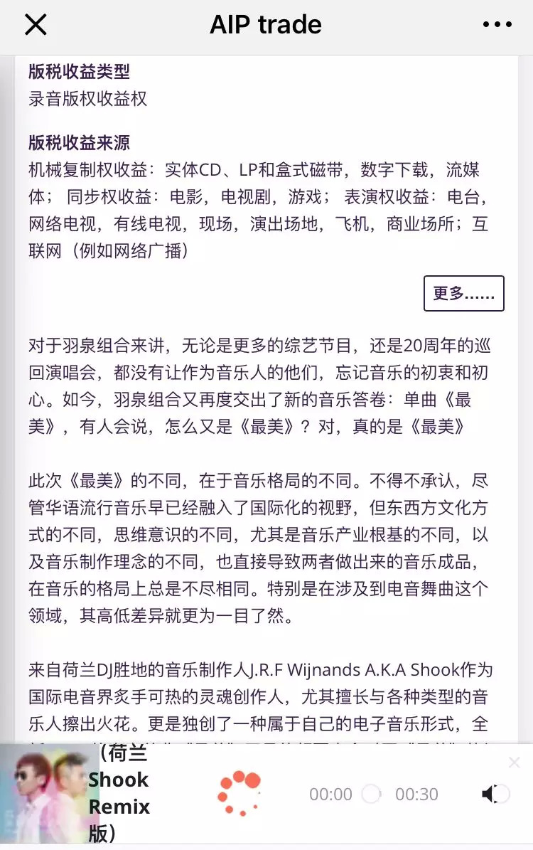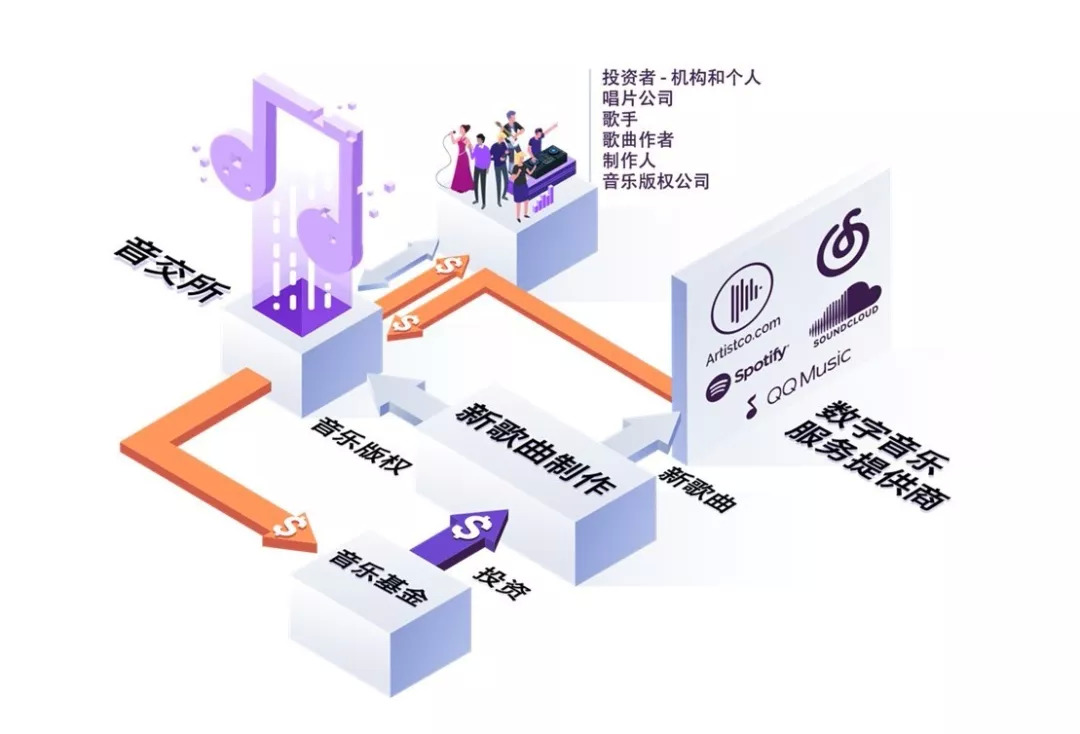 具体来说,通过音交所平台,音乐人可用一首歌曲的未来收益进行融资,提前获得可观的收入;乐迷、粉丝和投资者可以投资喜爱音乐人的歌曲,共同参与推广并分享歌曲未来的版税收入和潜在的高额资本交易利得。通过歌曲新股发行、音乐人和用户进行共识定价的机制,配合全球交易提高歌曲版税长期收益的流动性。