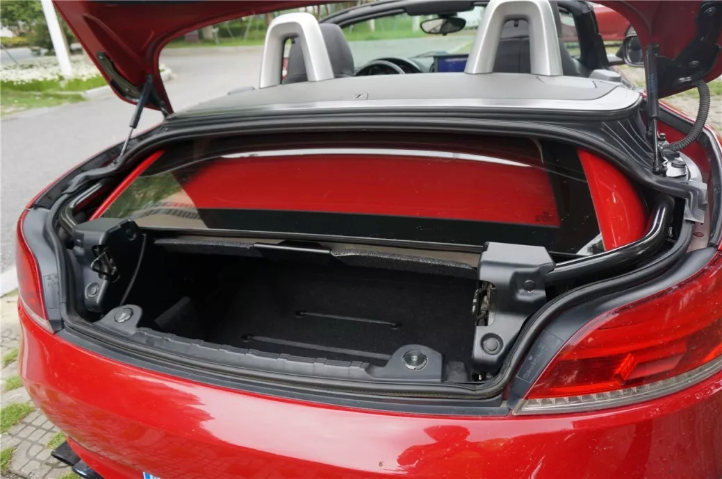 相信很多人都没怎么见过敞篷车的尾箱是什么样子的,看完下面这张图,大家心里就应该有数了吧。收起硬顶之后,中间剩下的一点空间还是够放几个双肩背包的,最大的问题在于开口比较小,塞稍微大一点的拉杆箱都吃力。