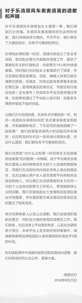 顺风车安全事故频发。今年5月,一位21岁的空姐被滴滴顺风车司机杀害,后郑州警方在河渠中打捞出犯罪嫌疑人尸体。5月10日,滴滴成立专案组,并且承认“负有不可推卸的责任”,5月11日滴滴再次发布声明,承认平台存在一定的漏洞,并且决定从5月12日零点起,在全国范围内下线顺风车业务,停业自查整改一周。