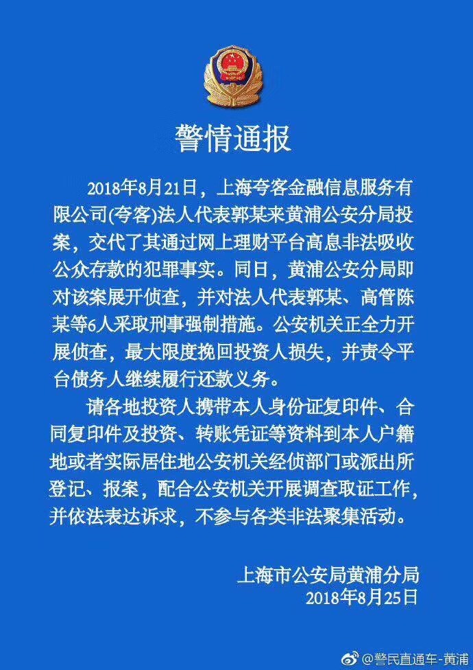 8月25日下午,上海市公安局黄浦分局官方微博“警民直通车-黄浦”发布消息称,8月21日,上海夸客金融信息服务有限公司法人代表郭某来黄浦公安分局投案,交代了其通过网上理财平台高息非法吸收公众存款的犯罪事实。同日,黄浦公安分局即对该案展开侦查,并对法人代表郭某、高管陈某等6人采取刑事强制措施。公安机关正全力开展侦查,最大限度挽回投资人损失,并责令平台债务人继续履行还款义务。