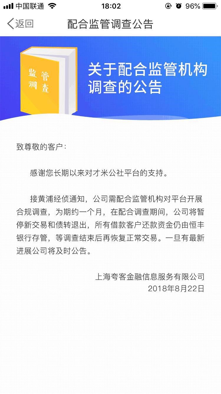 8月22日,夸客金融旗下独立的网络借贷中介服务平才米公社发布《配合监管调查公告》,称接黄浦经侦通知,公司需配合监管机构开展合规检查,配合检查期间将暂停新交易和债转退出。