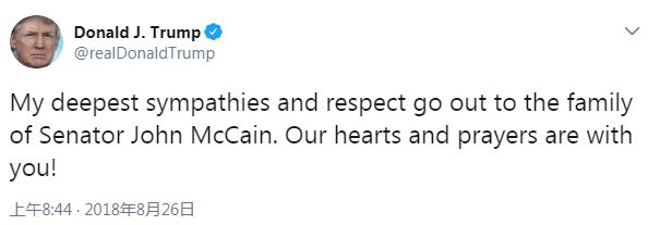 美国总统特朗普表示,对已故参议员麦凯恩的家人送去“同情和敬意”。此前有报道称,麦凯恩的家人曾在5月时对白宫表示,一直与特朗普不和的麦凯恩在自己的葬礼上“不想见到特朗普”。