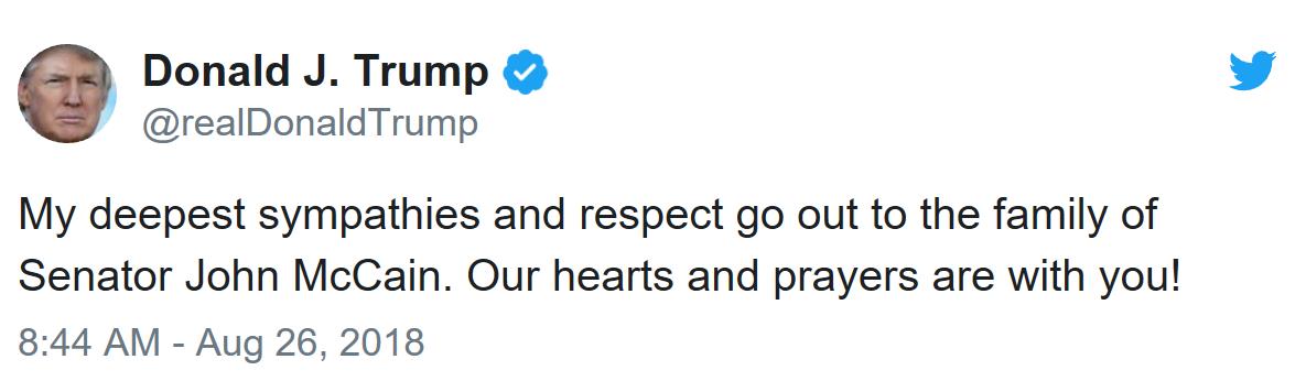 我向参议员约翰·麦凯恩的家人致以最深切的同情和尊重。我们的心和祈祷都与你同在!