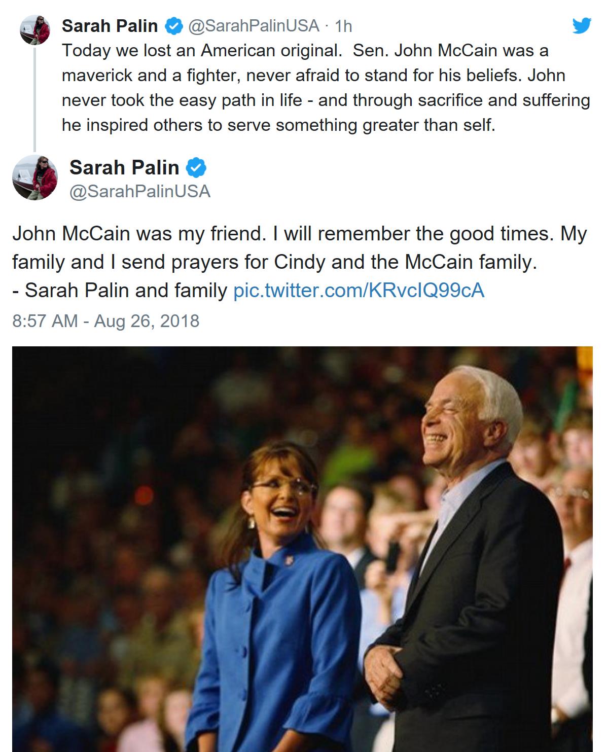 麦凯恩在2008届总统选举中的竞选伙伴、时任共和党副总统候选人萨拉·佩林写道: