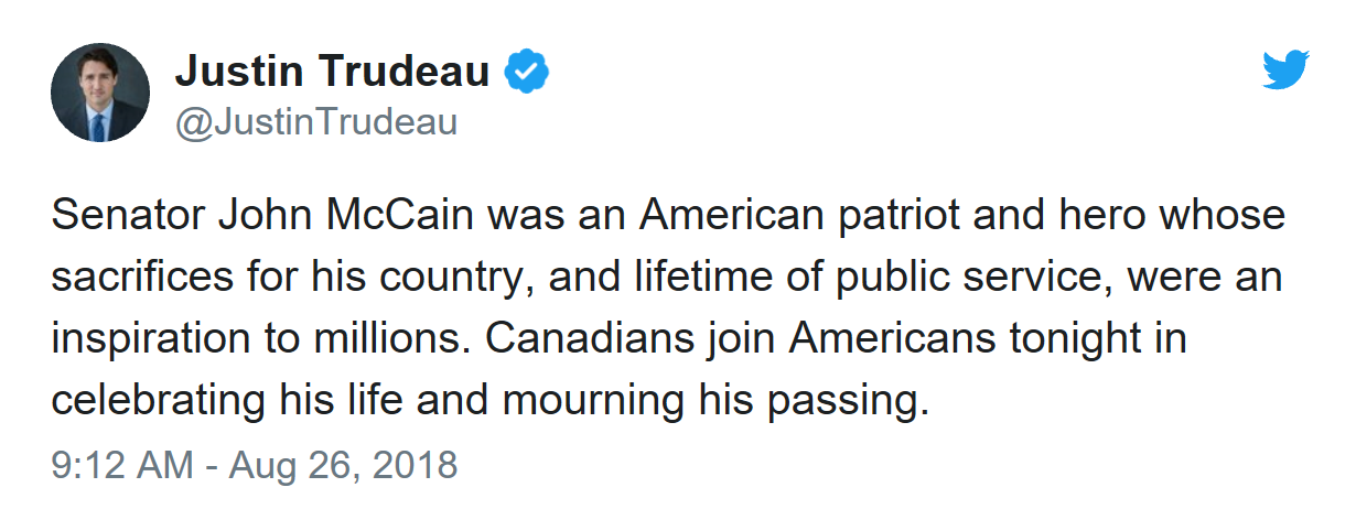 前副总统戈尔称,麦凯恩是“美国英雄、真正的爱国者”。加拿大总理特鲁多也发推特说,麦凯恩激励着成百上千万人,加拿大人和美国人一同哀悼他的离世。