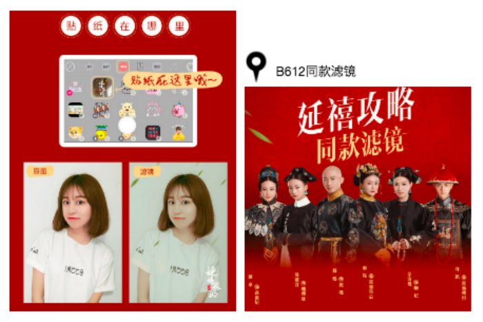 只看剧怎么过瘾?深谙观众心理的B612咔叽相机,根据《延禧攻略》中各种高级感配色做出了同款滤镜,这就让大家扮上了,顺带过过瘾。