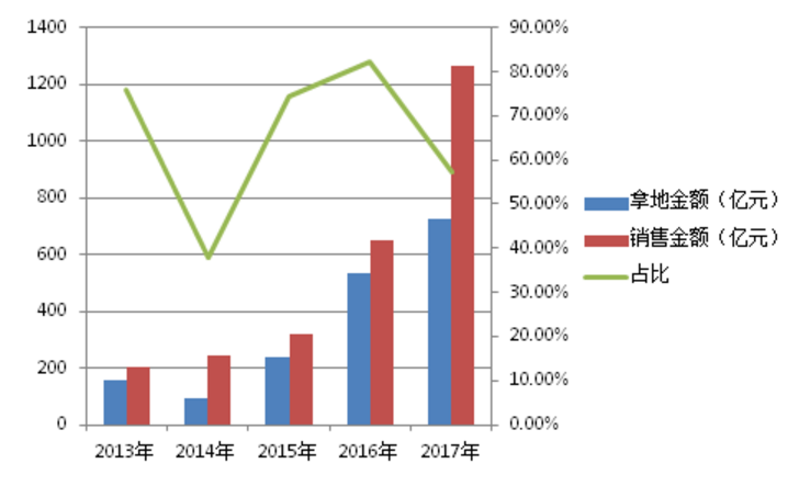 而从新城控股近几年的发展情况来看,也明显处在高速发展期,从当初的百亿销售额跨入了千亿俱乐部,尤其是2015年至2017年,公司拿地金额连续三年快速提高,分别达到238亿元、536亿元和724亿元,2015-2016年拿地金额占同期销售金额的比例也居高不下,2017年尽管降至57.21%,也正是由于之前加速拿地换取了之后销售金额的大爆发所致(2017年销售金额超额完成比例高达49%)。