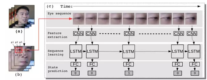 为此,吕思伟教授使用CNN(卷积神经网络)进行人脸中眼睛眨眼的特征识别。然而,该检测只能针对单张图像进行分析处理,而人类的眨眼活动是周期性的,为识别眨眼这一动作,需要再追加一个LSTM(长短期记忆递归神经网络)用于记录一段时间内的连续性行为。