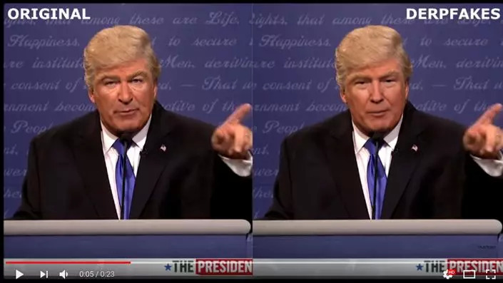 2018年初,youtube上有人放出基于Deepfake技术制作的关于川普的模仿视频:原视频是 Alec Baldwin 周末晚间秀一段模仿川普的视频,但是一位youtube的博主 “ derpfakes” 训练换脸 AI 将 Alec Baldwin 的脸换成了川普的脸。可怕的是,该技术已经能够达成像素级的人脸识别,展现出了以假乱真、颠倒黑白的潜力。