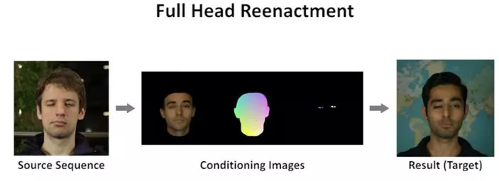 例如,H. Kim 等研究人员在SIGGRAPH2018年的论文“Deep Video Portraits”展示的技术,体现了使用一个人的表情特征来驱动另外一个人的面部,最终生成的视频,包含着自然的眨眼特征,其效果如下所示: