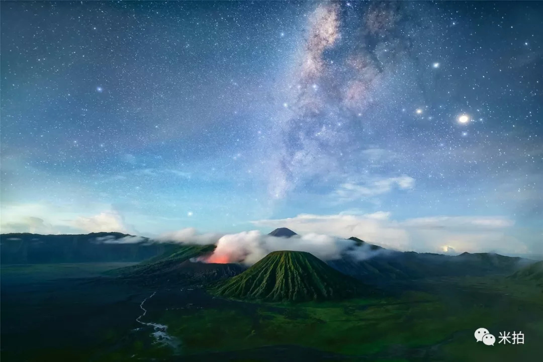 “记得去印尼拍摄火山的时候,第一个去的是林家尼火山,特别高,而且山上还是那种特别难走的石头路。当时我们从早上9点开始爬,一直爬到了晚上8点,中间没有丝毫停顿——真是爬到怀疑人生。第二个是为了拍布罗莫火山和星空的照片,我们在岛上连续熬了整整7天!每天凌晨上山都被冻得瑟瑟发抖,拍摄期间还夹杂着雷雨、大雾等恶劣天气。虽然一直处在饥寒交迫之中,但最后也十分幸运地拍到了这张集火山、银河、闪电、云雾、沟壑的照片。”