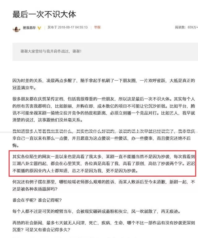 最后,《如懿传》还带着原罪,那就是涉嫌抄袭。今年8月,如懿传定档后,著名畅销书作家匪我思存发长文《最后一次不识大体》称,早在一年前她就指出了《如懿传》抄袭,但这并没有影响这部剧的播出。
