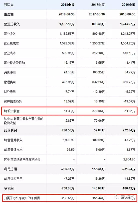 值得一提的是,2017年净利润为正,与其当期获得丰厚的投资收益不无关联。2017年上半年,毅航互联投资收益高达370.06万元,远高于2016年中报的-11.85万元和2018年中报的11.33万元。