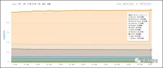 本周,根据CoinMarketCap数据,截止2018年8月26日,全球区块链资产市值占比前三为比特币53.79%,以太坊13.04%,瑞波币5.99%。本周以来,比特币占比提升2.49%,以太坊占比下降1.18%,瑞波币占比下降0.31%。