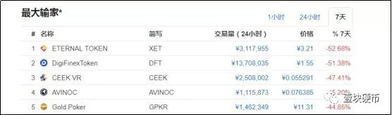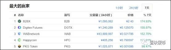 本周,根据CoinMarketCap数据,截止2018年8月26日,全球区块链资产涨幅最大的是B2BX(B2B),7天涨幅为174.93%,报2.40元;跌幅最大的是ETERNAL TOKEN(XET),7天跌幅为52.68%,报3.21元。