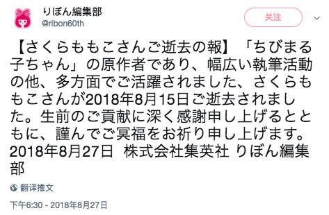 8月27日,据集英社《RIBON》编辑部消息,《樱桃小丸子》的作者樱桃子 (日语:さくらももこ,本名三浦美纪)于8月15日因罹患乳腺癌去世,享年53岁。