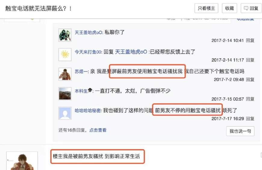 在触宝电话的百度贴吧,有着许多题为《触宝真是害人不浅,方便了那些变态来到处拨打骚扰电话》、《老是被触宝电话骚扰烦死了》、《万能的吧友我被他用触宝电话骚扰怎么办》等帖子。
