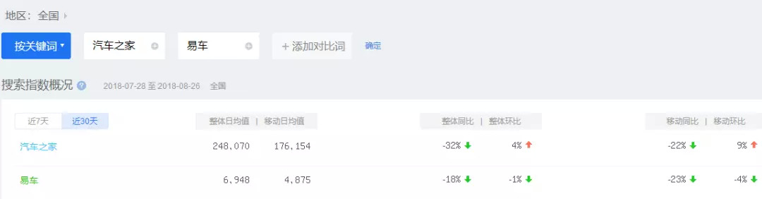 根据最新的流量数据,汽车之家对外表述的日活为3300万,而易车并未公布,但是根据最近一个月的百度搜索指数来看,汽车之家的整体日均值达到了24.8万,而易车只有近7千。