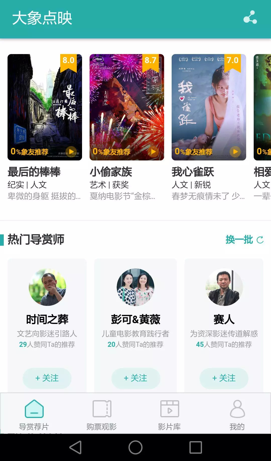 “导赏师计划”的内容是:大象针对影院观众、纪录片爱好者、文艺青年、资深影迷、小白影迷、亲子观影需求的父母等不同细分人群(注:并非基于某种算法,当然目前此功能也处于测试阶段,或将在运行一段时间之后根据效果进行必要的调整),邀请资深影评人入驻,旨在为各类用户提供贴心的观影服务,在鱼龙混杂的海量片库中找到最合适的影片,为用户节省选片时间成本,避免踩雷,并通过导赏大幅提升观影体验。这个计划还有一层考虑是,让影评人可以本着对观众服务的态度,负责任地推荐影片、引导观赏、创造价值,从而获得一份体面的收入,让影评人在中国可以成为一个堂堂正正的职业。导赏师的酬劳目前是按照文章的篇数来结算。