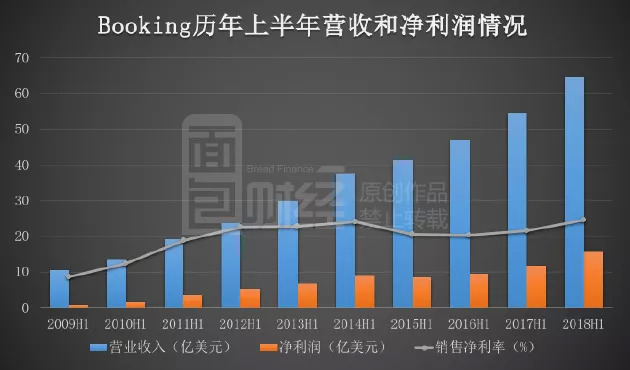 2009年上半年至2018年上半年,Booking的营收增长了5.07倍,净利润增长了16.22倍,同期净利率提升了15.87个百分点。