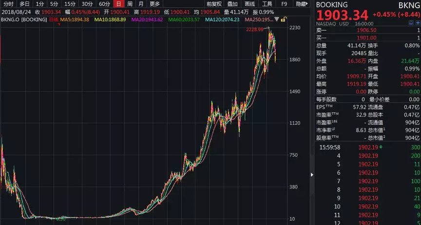 在如此迅猛的业绩增势下,Booking的股价涨幅也很惊人:2009年初至今复权股价上涨了超过25倍。股价走势图如下: