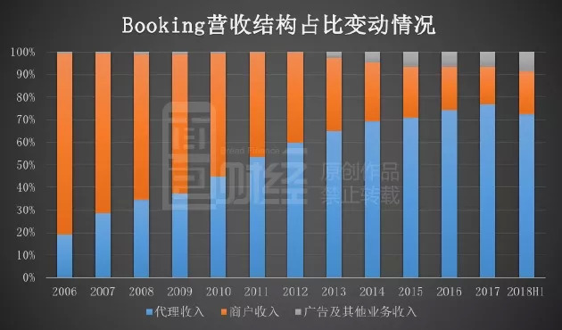事实上,翻查Booking的历年财报,其营收结构占比较早年已经发生了巨大的变化,三项营收的占比变动情况如下图: