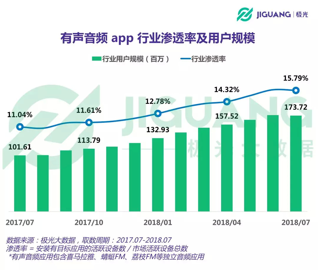 根据极光大数据的统计结果,有声音频app的行业渗透率和用户规模在过去一年的上升幅度均非常显著。截至今年7月份,有声音频app的行业整体渗透率达到15.79%。与此同时,该类别app的行业用户规模达到1.73亿,与去年同期相比增长比例为70.97%。