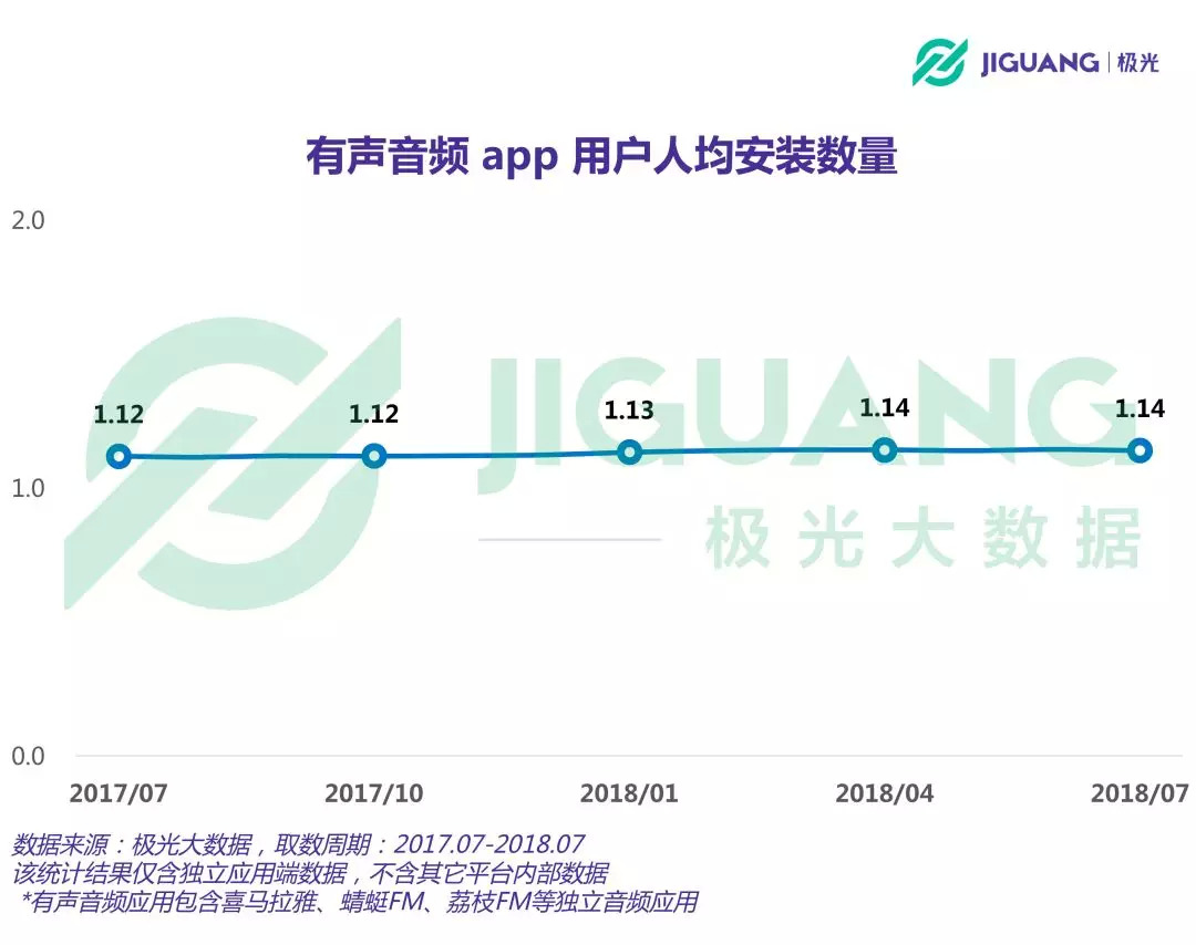 在过去一年,有声音频app的用户人均安装数量呈现出轻微增长趋势。截至今年7月份,有声音频app的用户人均安装数量为1.14款,与去年同期相比变化并不明显。