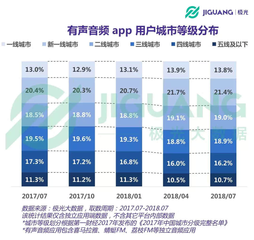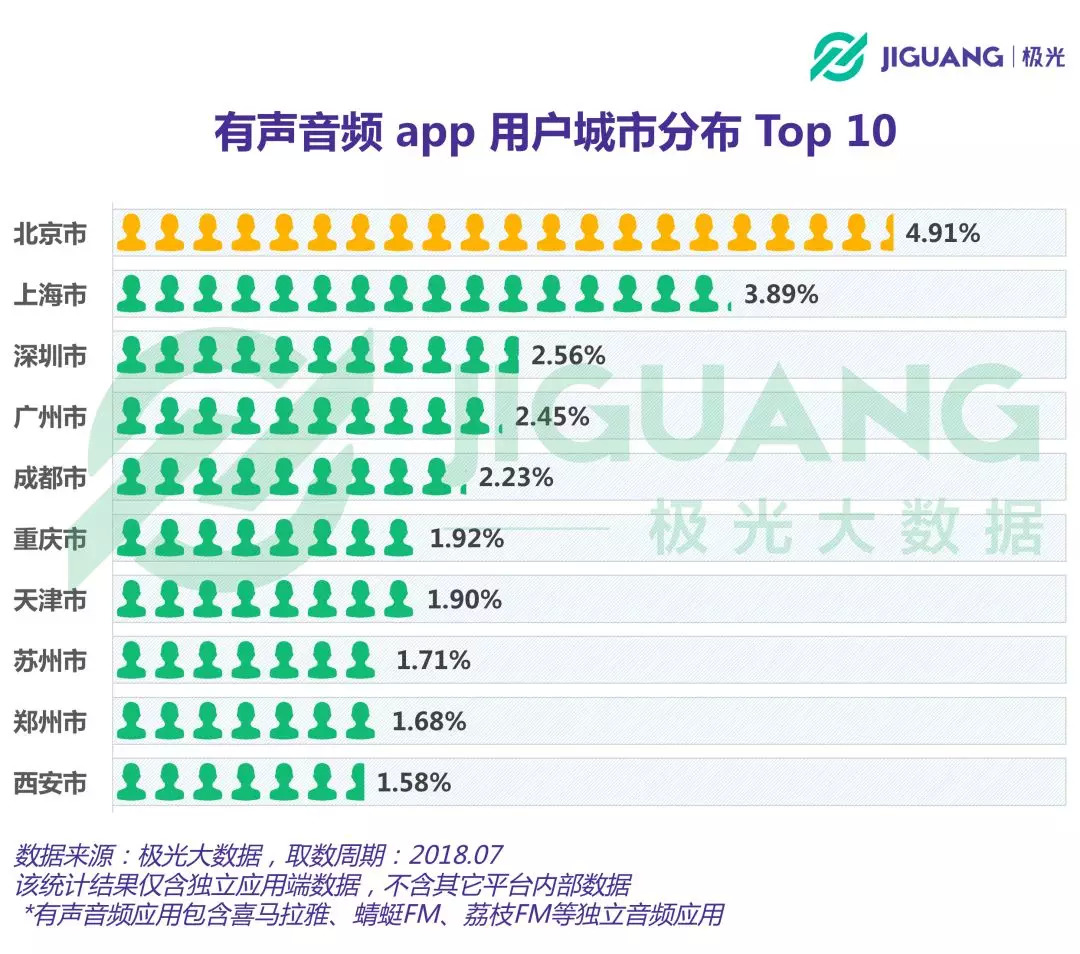 就独立城市而言,有声音频用户占比最高的城市是北京,其7月份的用户占比达到4.91%。排在第二位的是上海,其用户占比为3.89%,其余独立城市的用户占比均不足3%。